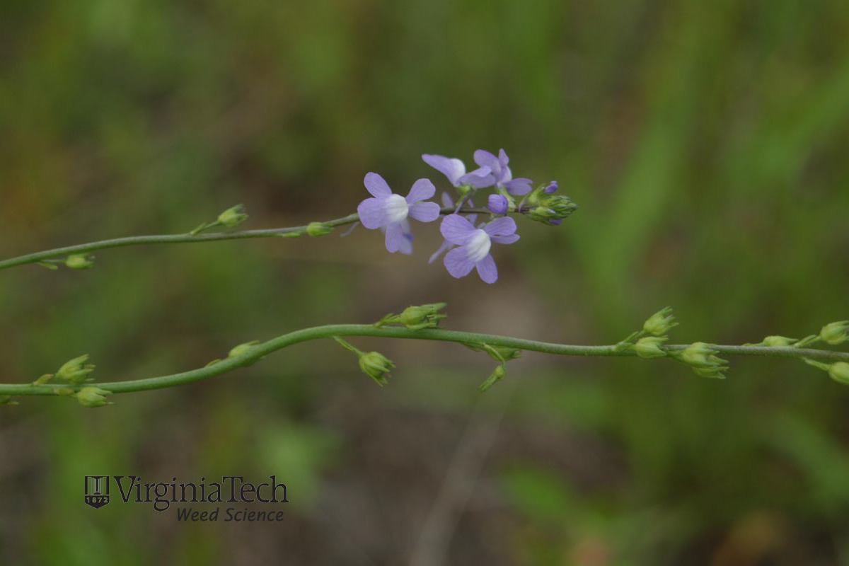 Flowers are 1/4-1/2 inch long, pale blue-purple with lighter palate, small, on top of slender stalks, spurred, pubescent internally. Upper lip erect, 2-lobed, and 5-6mm long. Lower lip 8mm long, 1.3cm broad, glabrous, and 3lobed. Lobes to 3mm long, 1mm broad (in flower), linear-oblong, acute, green, glandular pubescent.