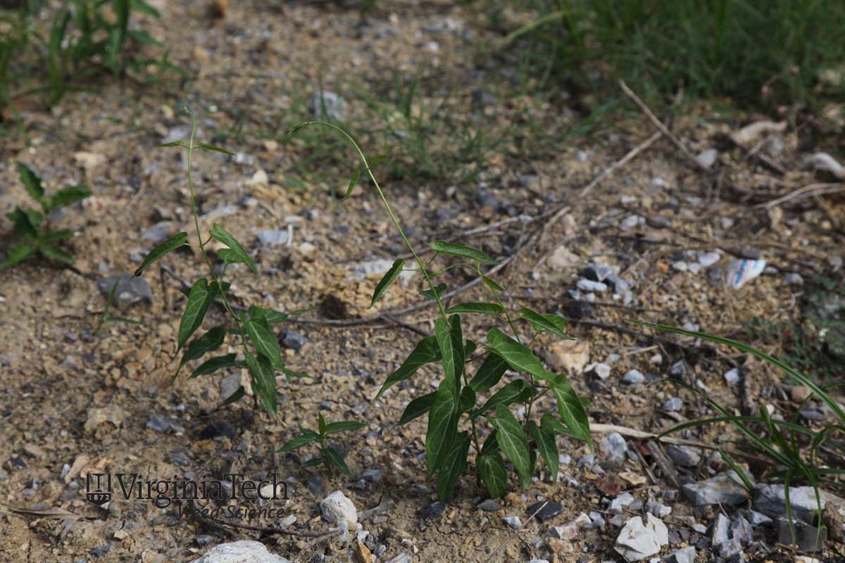 A perennial with slender, twining stems that may reach 10 ft in length. Found throughout the southeastern United States. Although the name implies a secretion of milky sap as in other milkweed species (Asclepias spp.), this does not occur in the leaves or stems of honeyvine milkweed. A perennial twining vine with opposite leaves and relatively large fruit (follicle). This weed is often incorrectly identified as a morningglory (Ipomoea spp.) or Field Bindweed (Convolvulus arvensis). However, the prominent white veins distinguishes this weed from any of the morningglories, and the heart-shaped leaf distinguishes this weed from field bindweed
