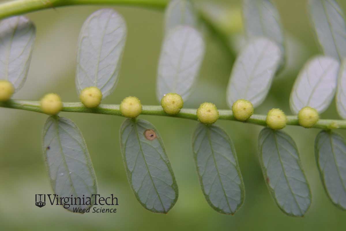 Chamberbitter has greenish white flowers. A very small wart-like fruit, greenish-red, is underneath every pair of the feathered leaves.