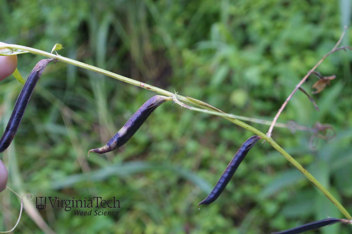 The four-angled legume is from 1.5-5.5 cm long. It has from three to seven one-seeded segments. Seeds resemble hairy vetch but have a lighter colored rachis.