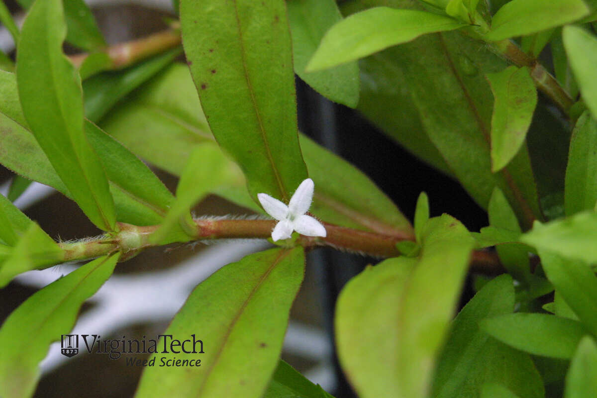 This plant can be identified by its semi-erect growing habits, its narrow hairless leaves, slightly angular stems with sparse hair, and by the 4 petaled flowers that are usually white but can also be pink. It closely resembles poorjoe, Diodia teres.