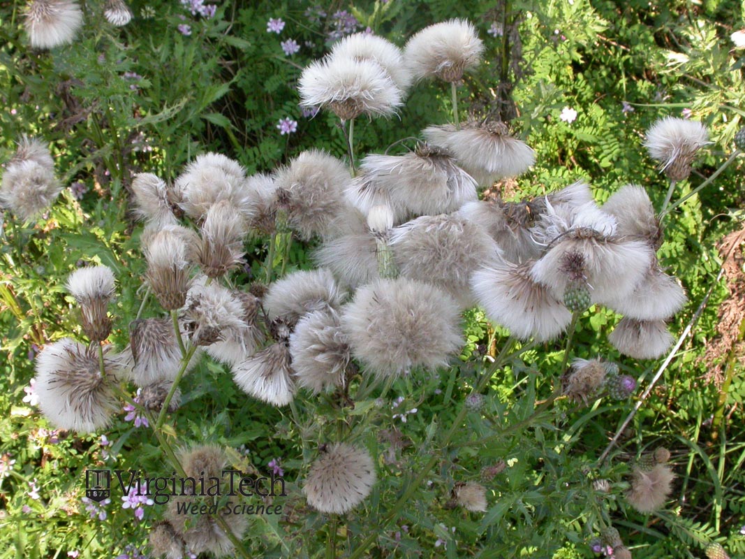 Canada Thistle produces flowers from about June until August. Generally, new shoots begin to form in January. The species spreads by creeping roots which in turn causes Canada thistle to often form dense patches.